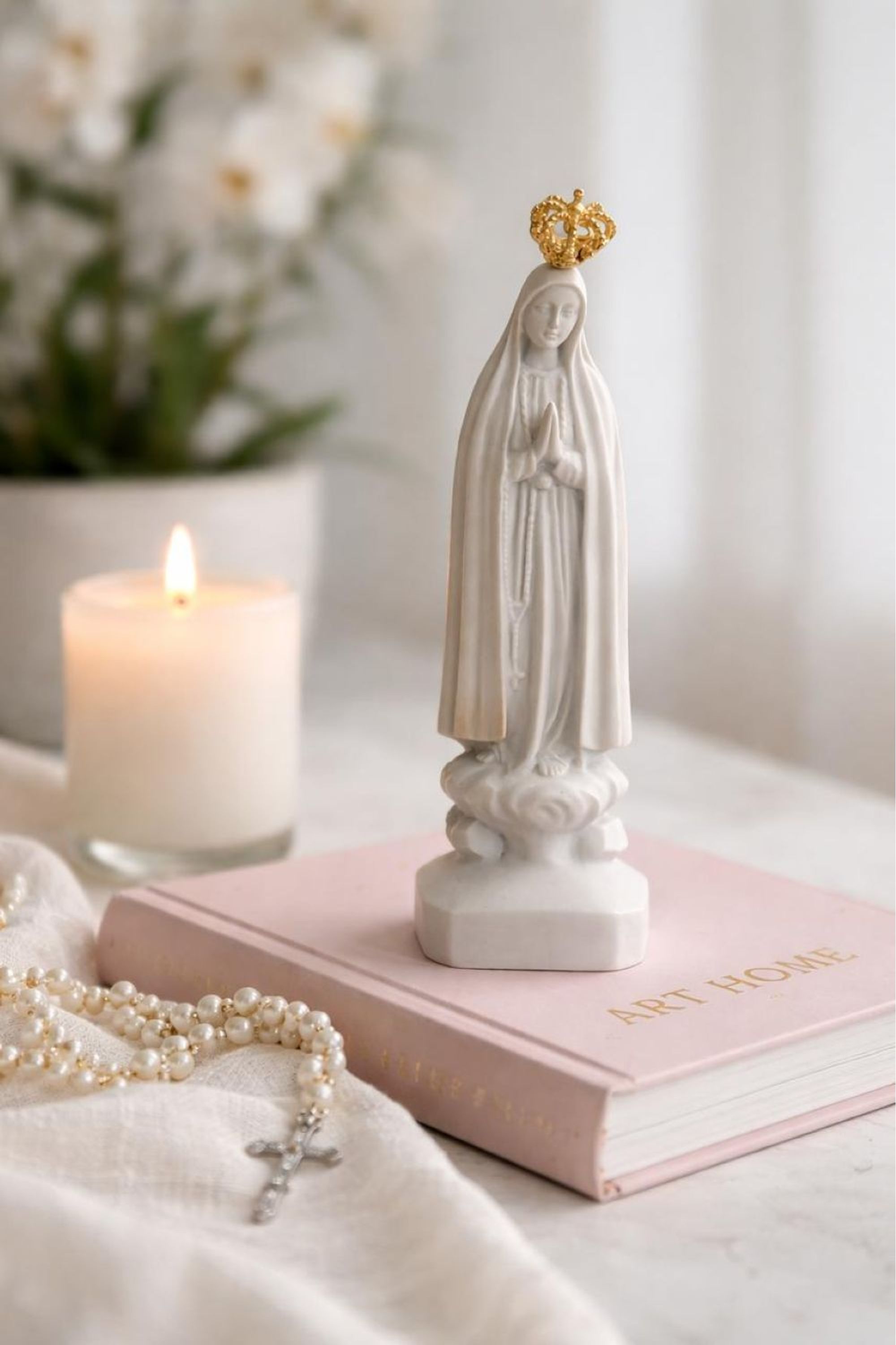 Imagem Nossa Senhora de Fátima em pó de mármore branca com coroa dourada.