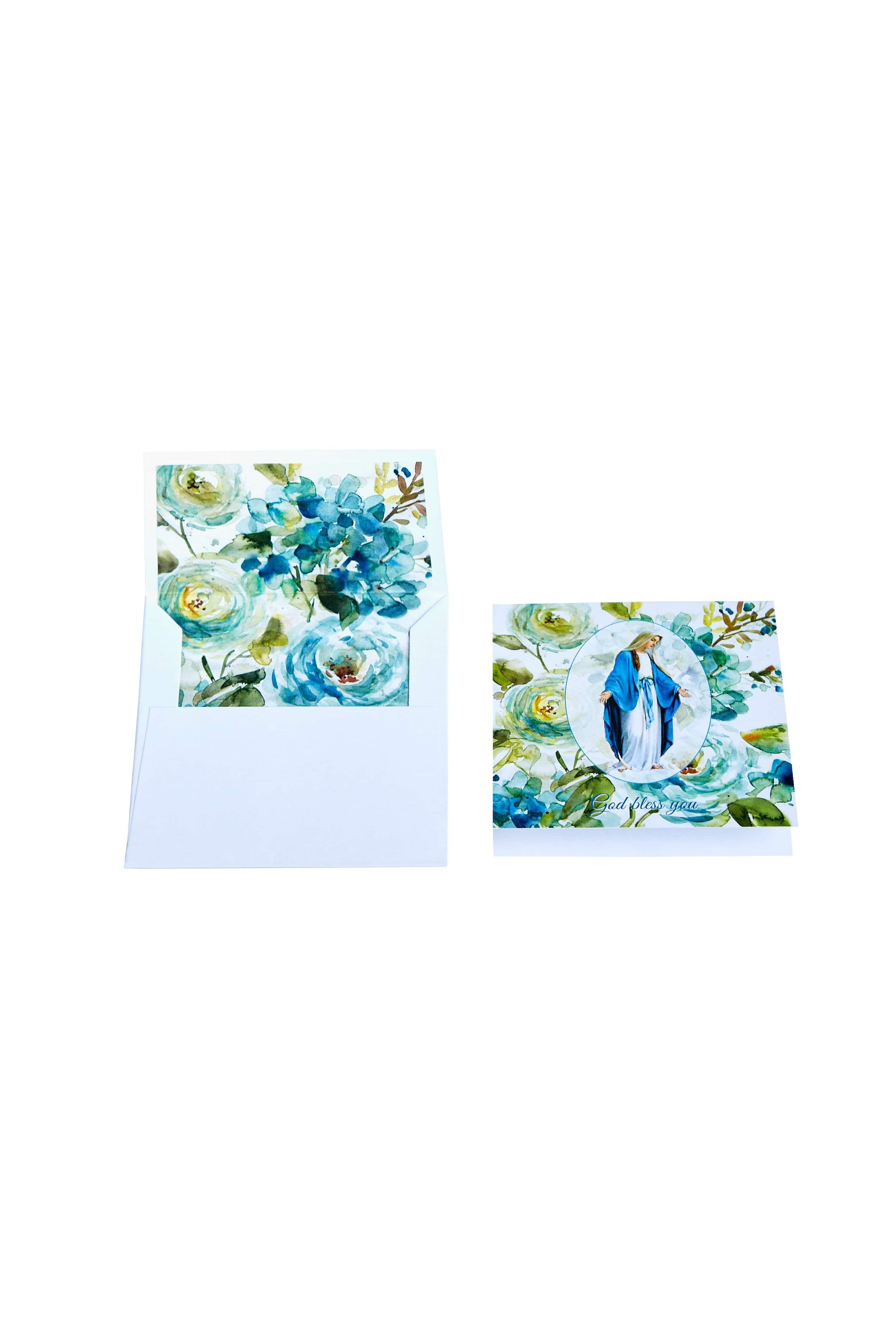 Kit com 6 cartões com Imagem de Nossa Senhora das Graças com flores e 6 envelopes brancos.