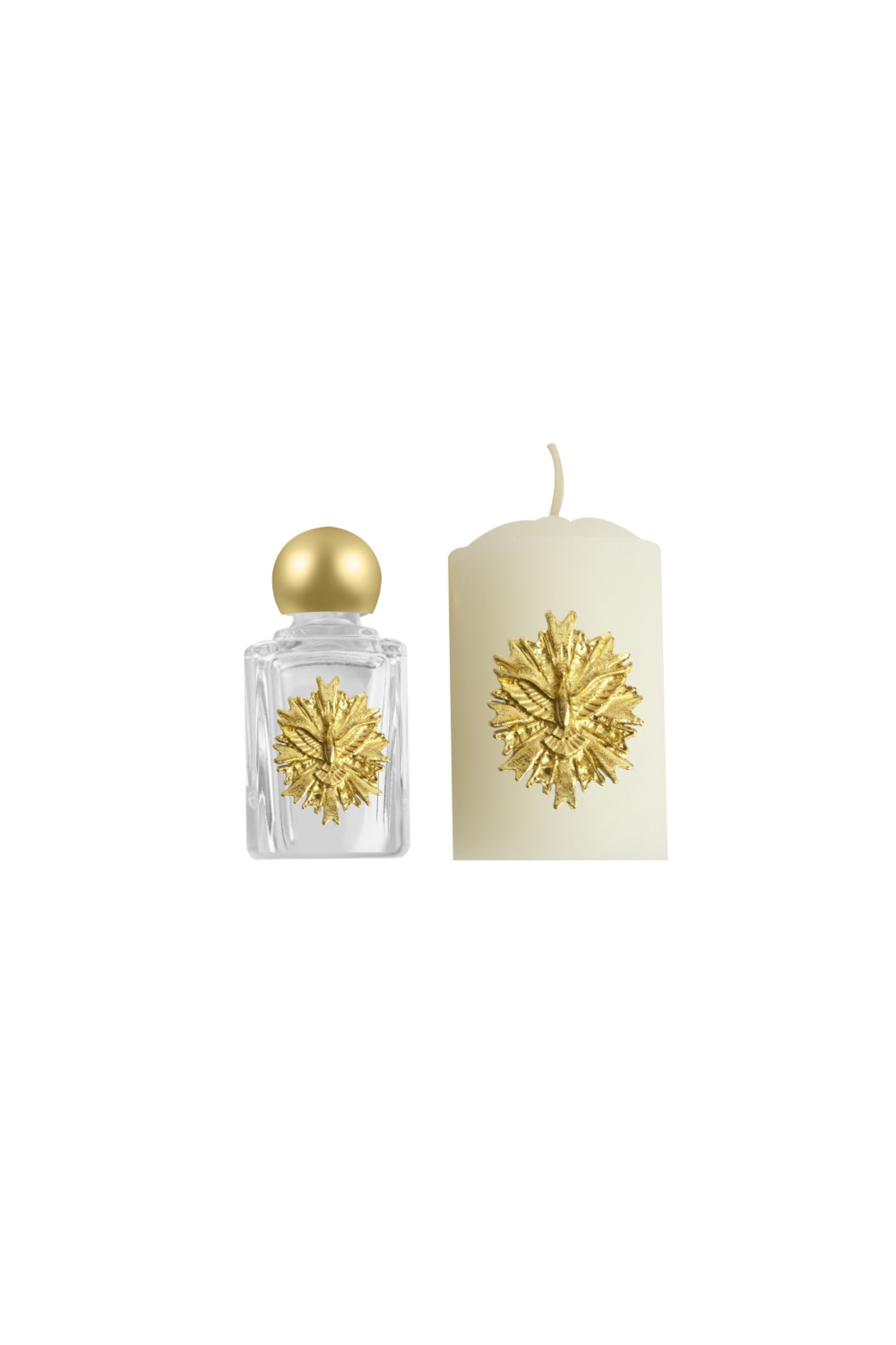 KIT VIDRO ÁGUA BENTA E VELA ESPÍRITO SANTO DOURADO