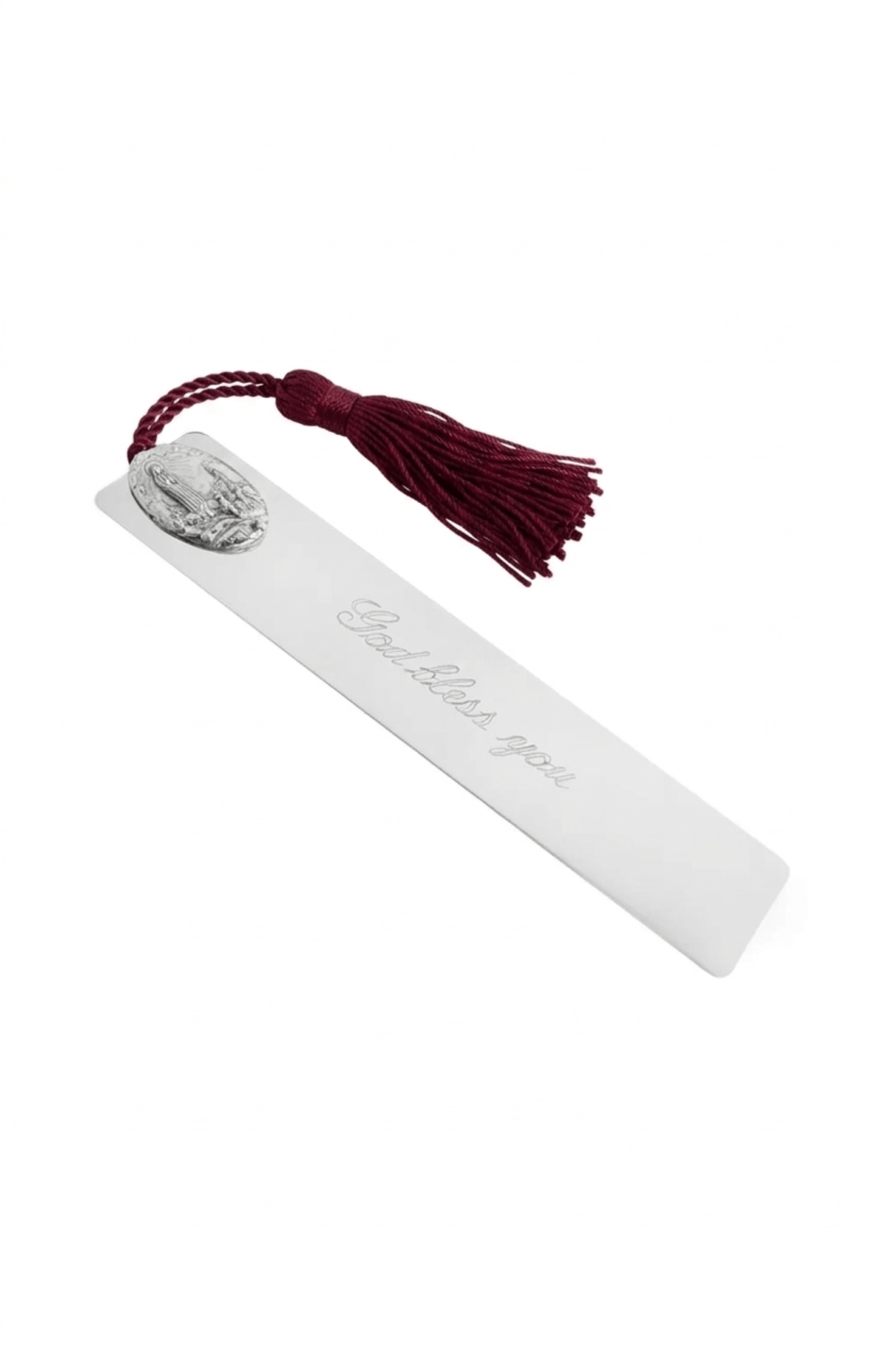 Marcador de página retangular em prata 90 com medalha de Nossa Senhora de Fátima e detalhe na cor vinho.