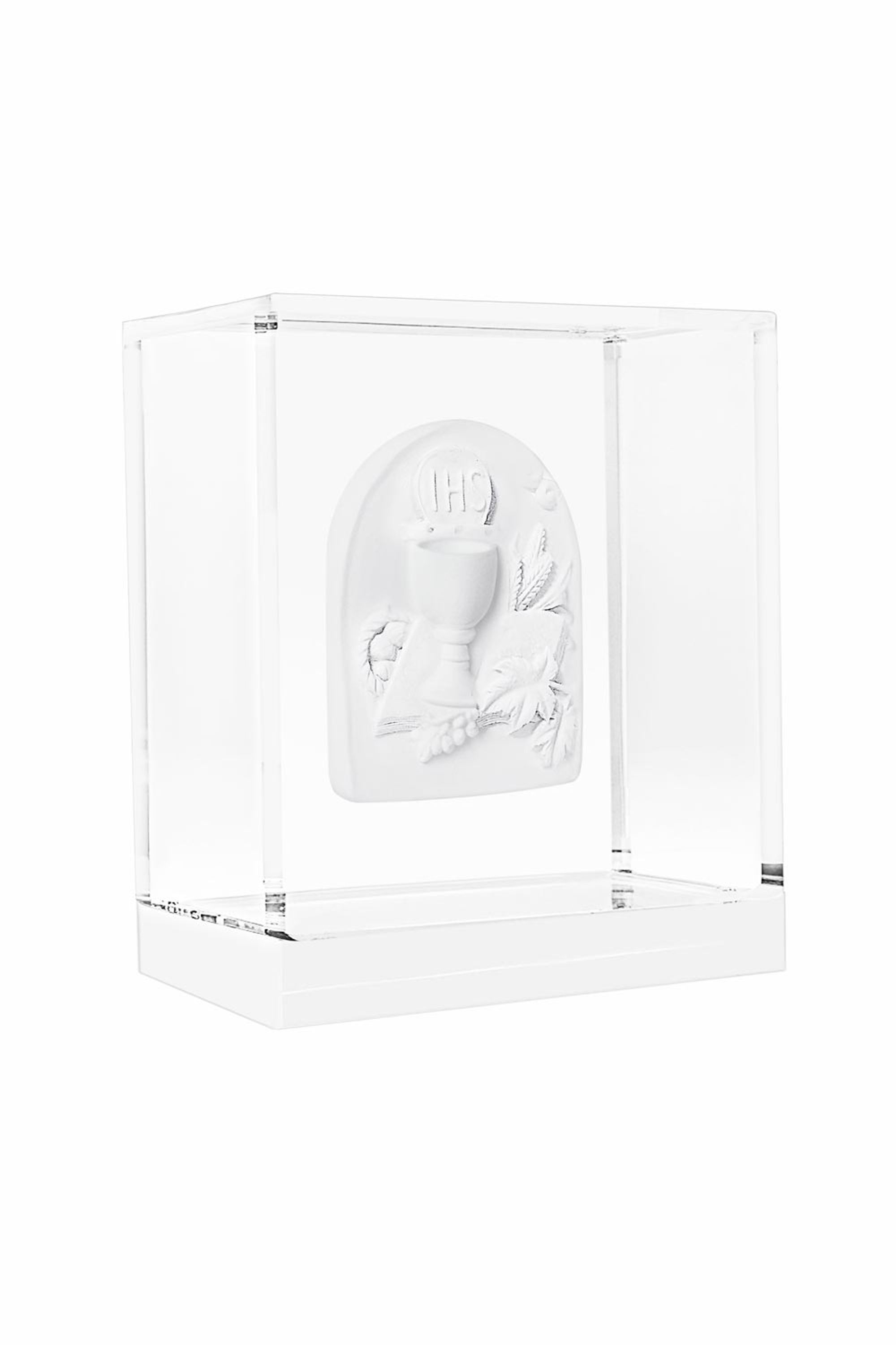 Medalhão Eucaristia em pó de mámore branco na caixa de acrílico.