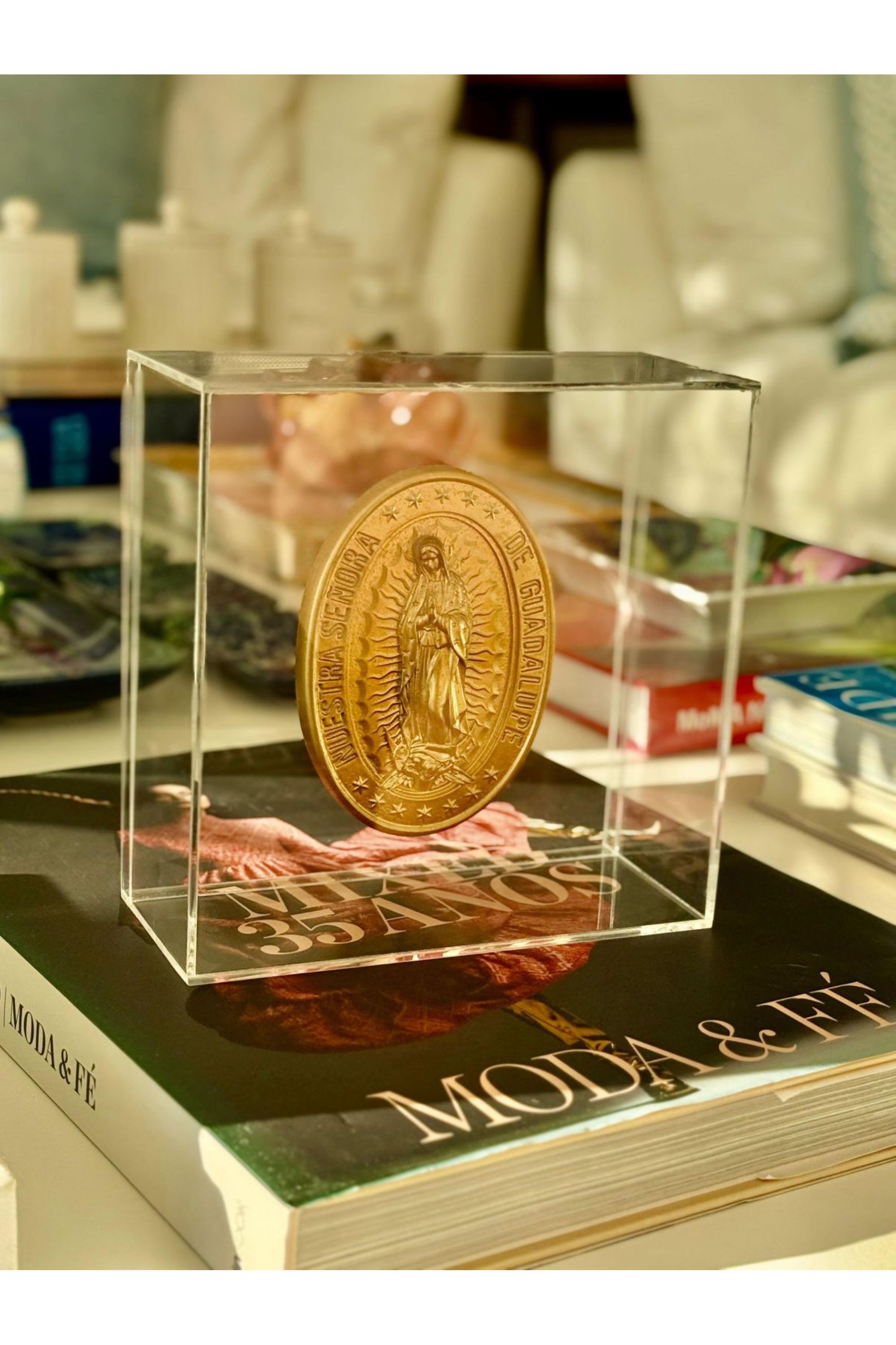 Medalhão Nossa Senhora de Guadalupe em pó de mármore dourado em caixa de acrílico.