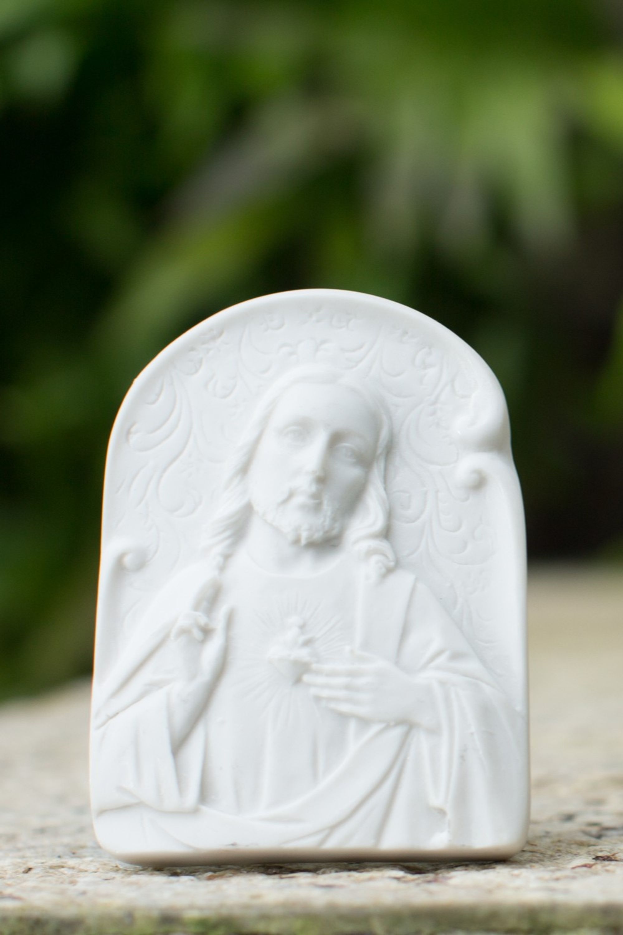 Placa Sagrado Coração de Jesus em pó de mármore branco com suporte em aço. Medidas: 8,5cm x 6,5cm