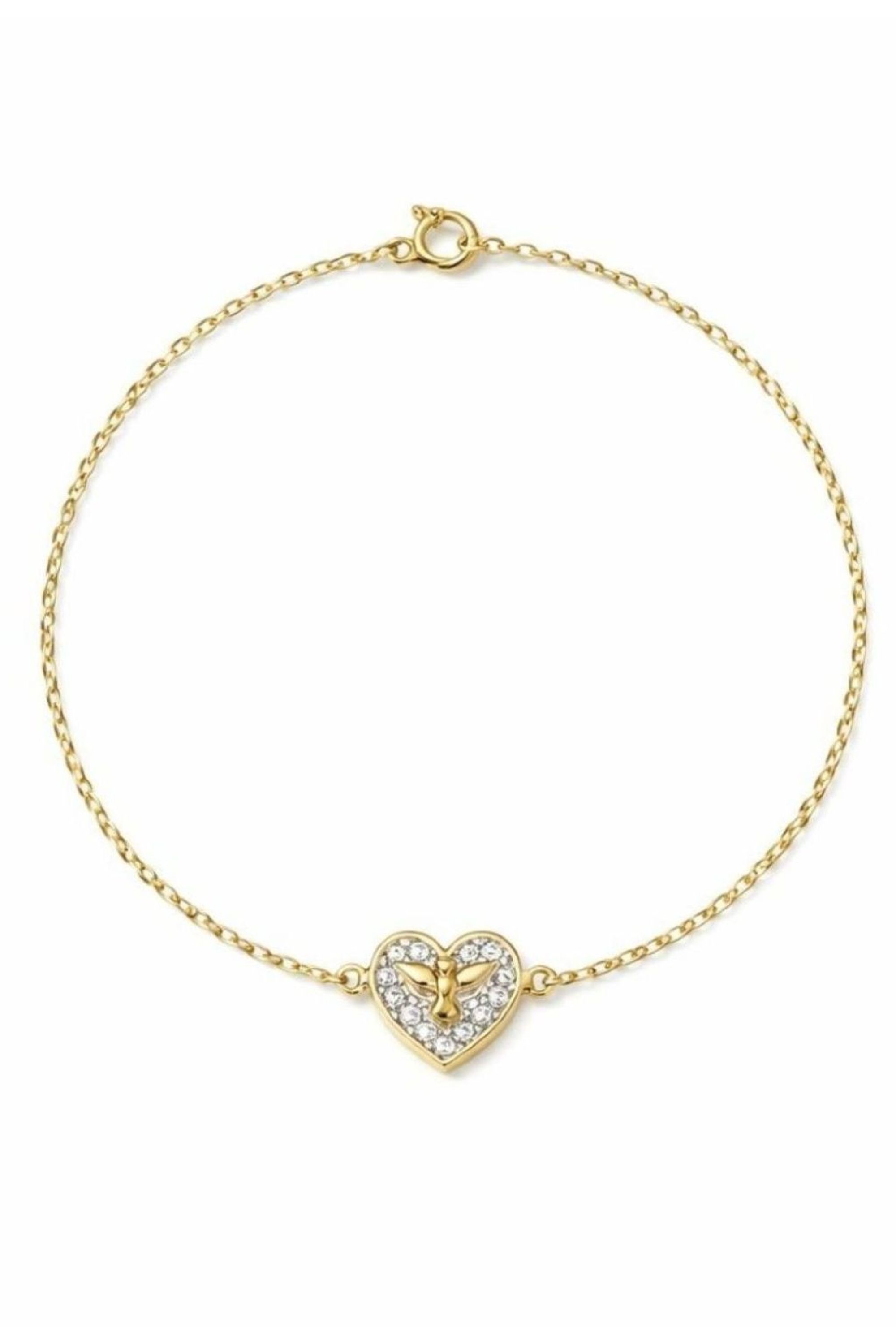 Pulseira em ouro 18K com coração microcravejado com brilhantes de 0,7 pontos e pombinha Espírito Santo.