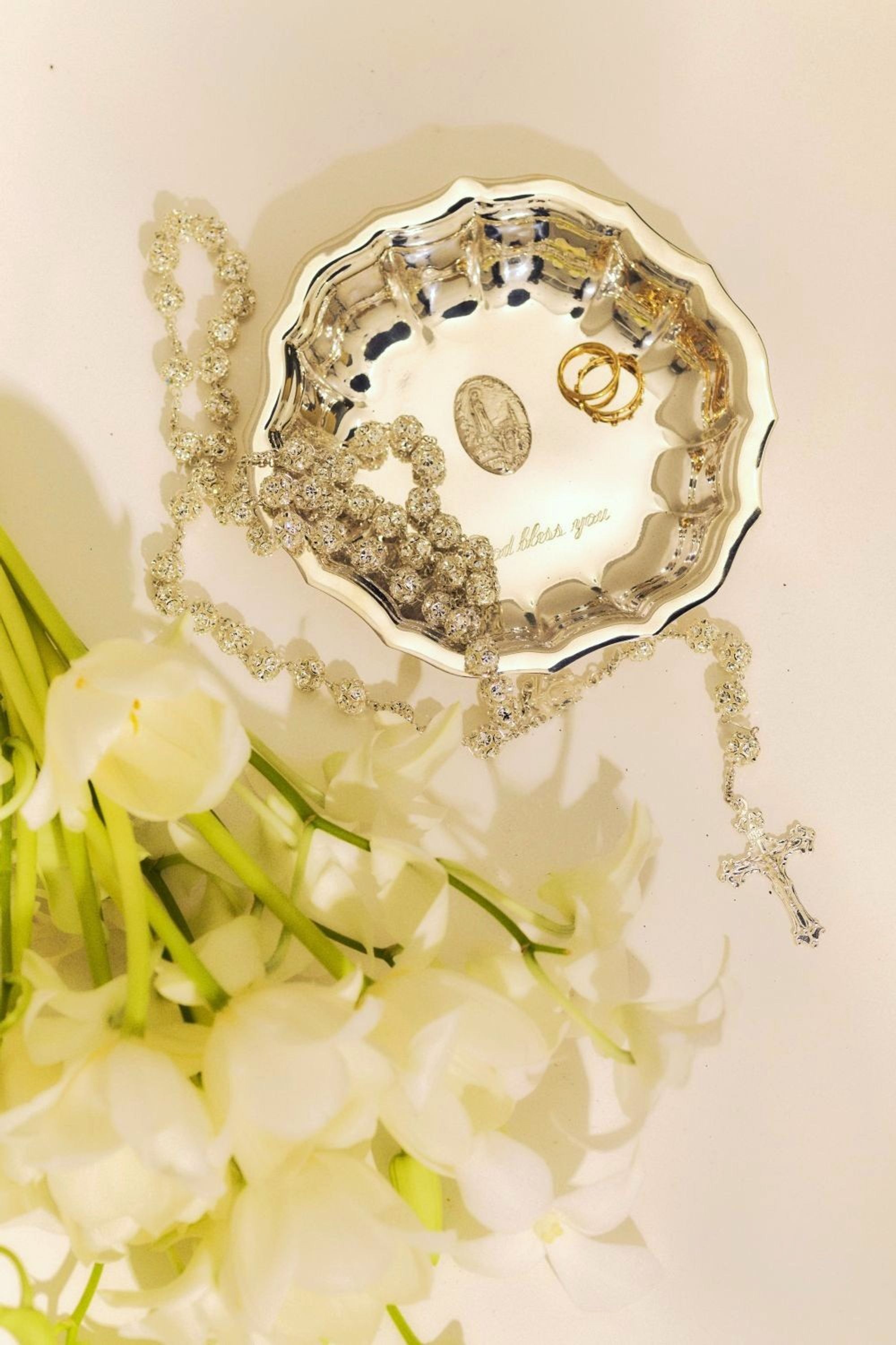 Salva Chipandelle redonda em prata 90 com medalha em metal de Nossa Senhora de Fátima.
