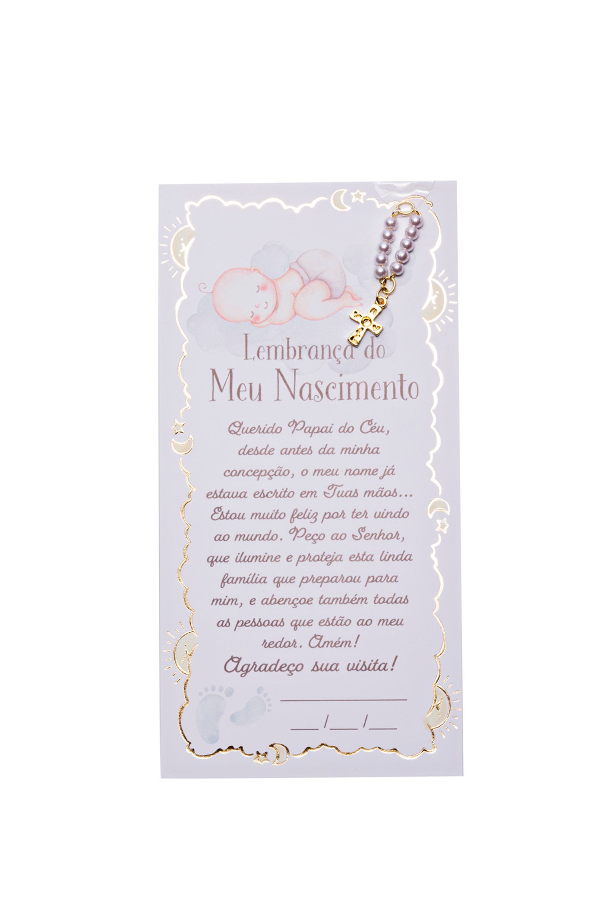 Santinho de Nascimento com pingente dourado Dezena pérola. Medidas: Santinho 13 cm x 6,5 cm dezena 3 cm.