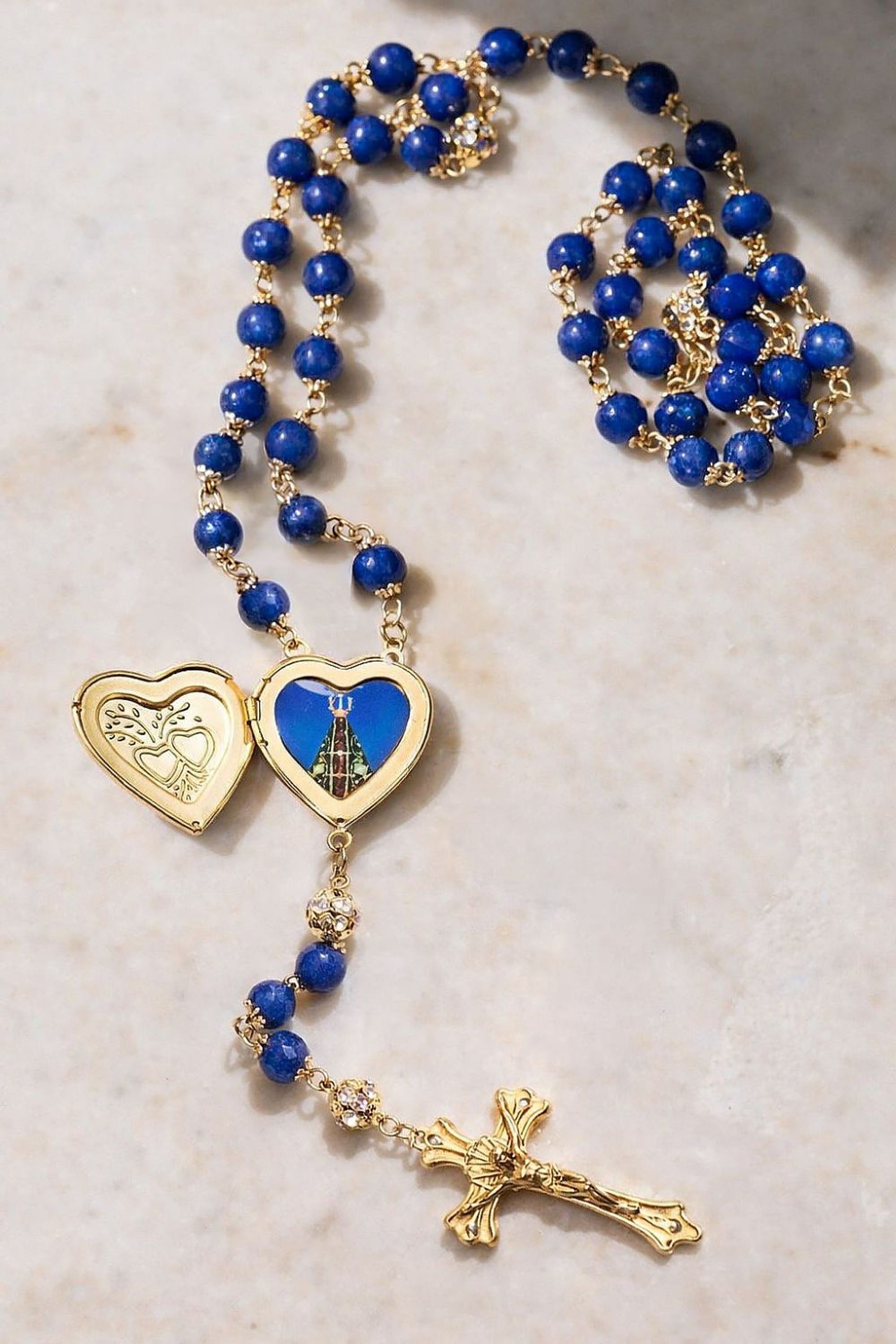 Terço com contas em Ágata Azul 10mm com relicário coração com imagem de Nossa Senhora Aparecida.