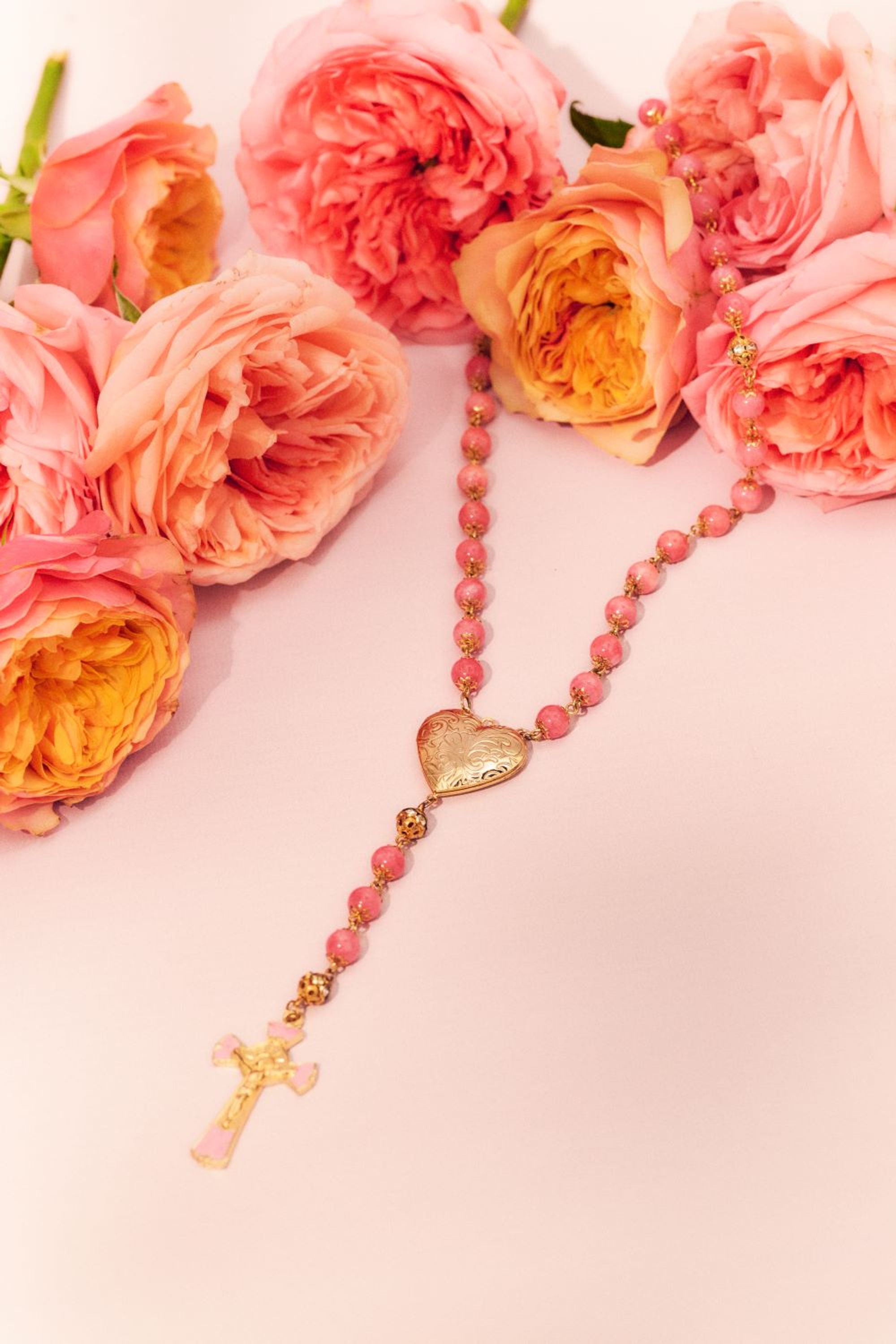 Terço Rodocrosita 10 mm Com Relicário Coração Santa Terezinha