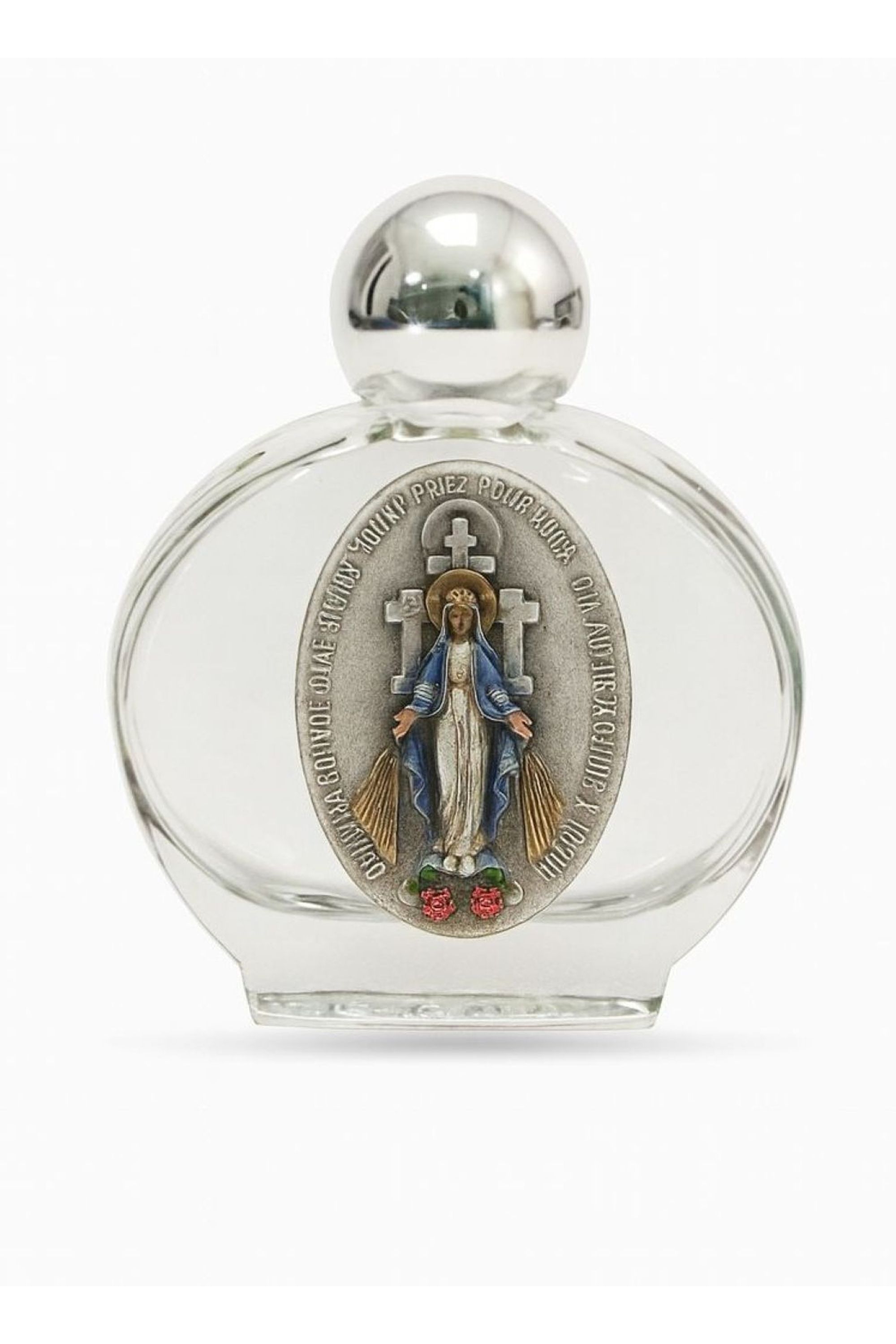 Vidro para Água Benta com medalha em metal esmaltado de Nossa Senhora das Graças.